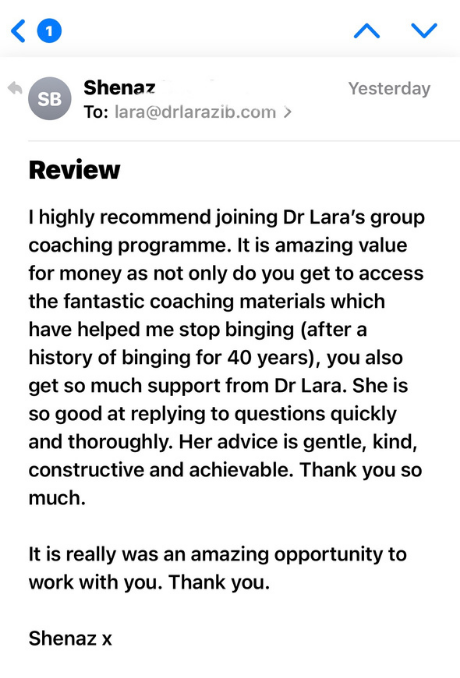 Each month, you’ll receive personalised feedback on your eating habits directly from me — a trained psychologist with a PhD and expert in disordered eating behaviours. Together, we’ll refine your “eating blueprint” to reduce the urge to binge, helping you move closer to lasting freedom from binge eating. With my guidance, you’ll gain the insights and strategies needed to stay on track and build healthier habits for the long term.